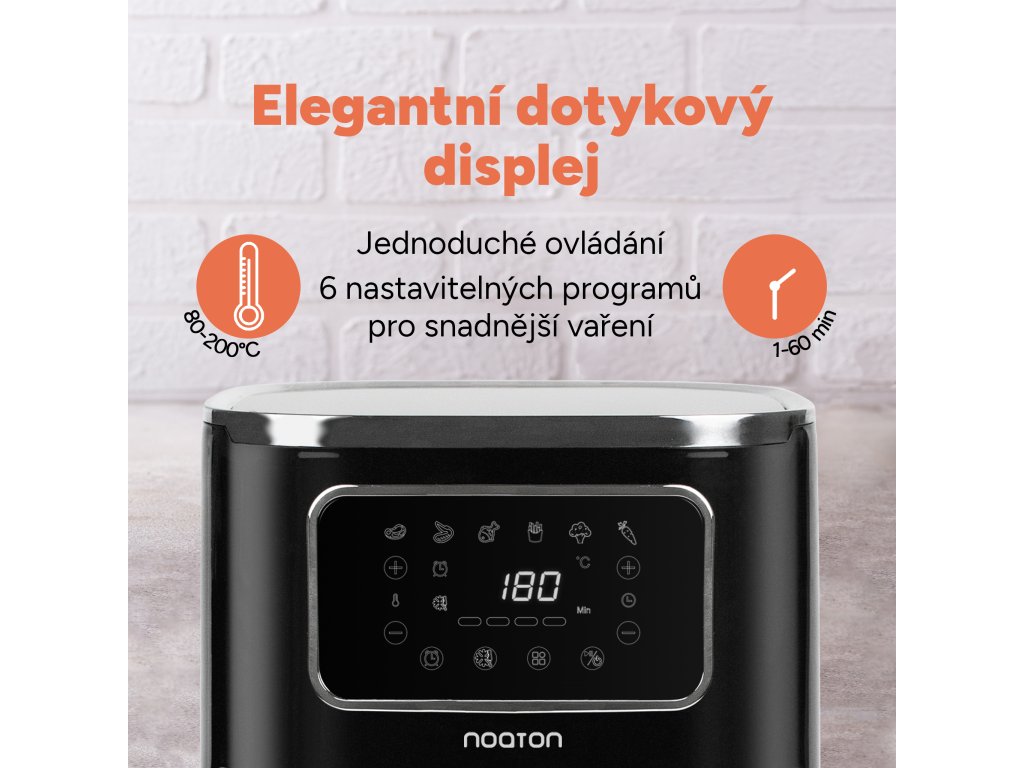 Noaton A44 Pro vyniká nejen výkonem, ale i intuitivním ovládáním. Jeho digitální displej vám umožní nastavit teplotu, časovač a vybrat z šesti přednastavených programů.