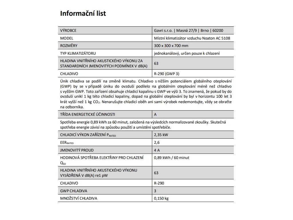 Mobilní klimatizace Noaton AC 5108 využívá přírodní chladivo R290. Jedná se o nový typ chladiva, který na rozdíl od svých předchůdců neobsahuje škodlivé freony. Nejen, že neničí ozonovou vrstvu, ale díky skvělým termodynamických vlastnostem zajišťuje efektivní a úsporný provoz, nezničí tedy ani vaši peněženku.