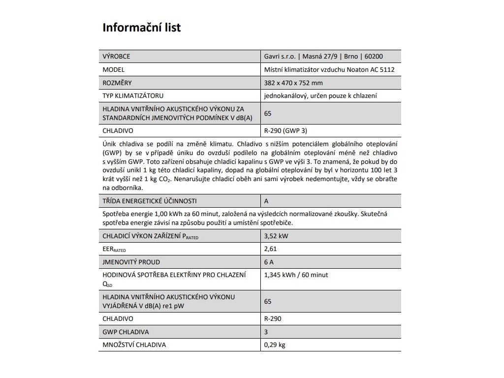 Typ přístroje | mobilní klimatizace |