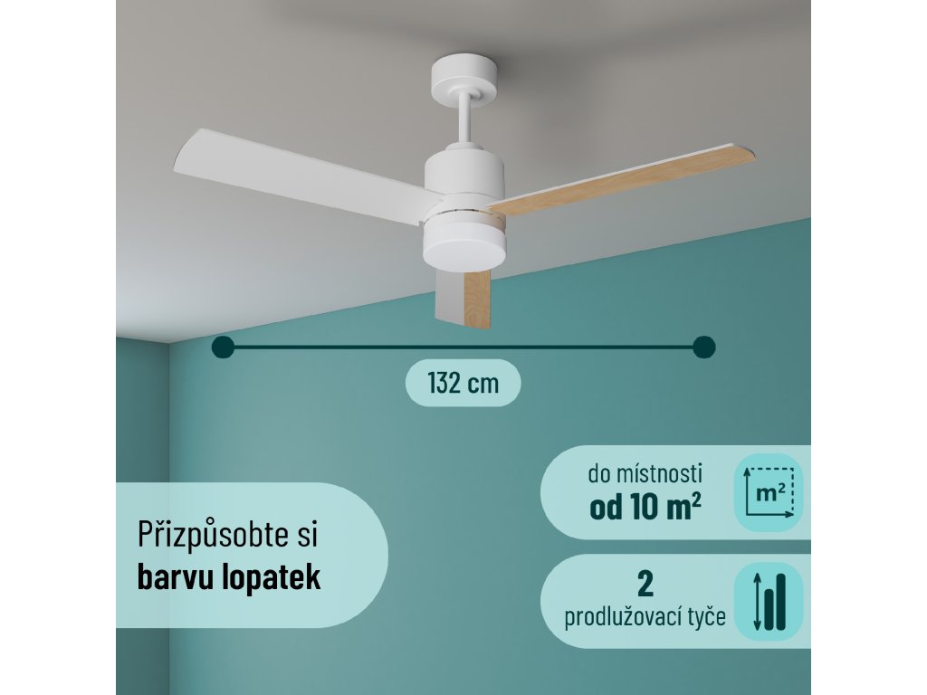 S našim ventilátorem se nemusíte spokojit pouze s jedním barevným provedením. Canis nabízí dvoubarevné řešení díky oboustranným lopatkám. Můžete si vybrat mezi preferencí bílé klasiky nebo elegantního světlého dřeva, a vybrat takovou kombinaci, která bude ladil právě s vaším interiérem.