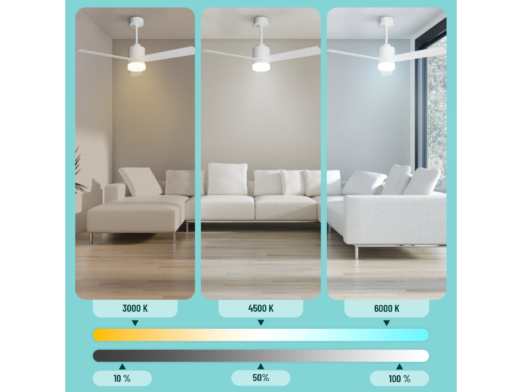 Ať už je vaše světelná preference jakákoliv, stropní ventilátor Canis se vám jistě trefí do vkusu. Potřebujete se soustředit během studia nebo práce? Zkuste nastavit studený odstín LED osvětlení (6000 K) a vaše produktivita vystoupá k výšinám. Plánujete večer s přáteli nebo rodinné posezení? Teplý odstín (3000 K) vám vytvoří komfortní prostředí pro uvolněnou konverzaci. Jestliže hledáte kompromis mezi těmito odstíny, můžete se vydat zlatou střední cestou a nastavit přirozené denní světlo (4500 K)