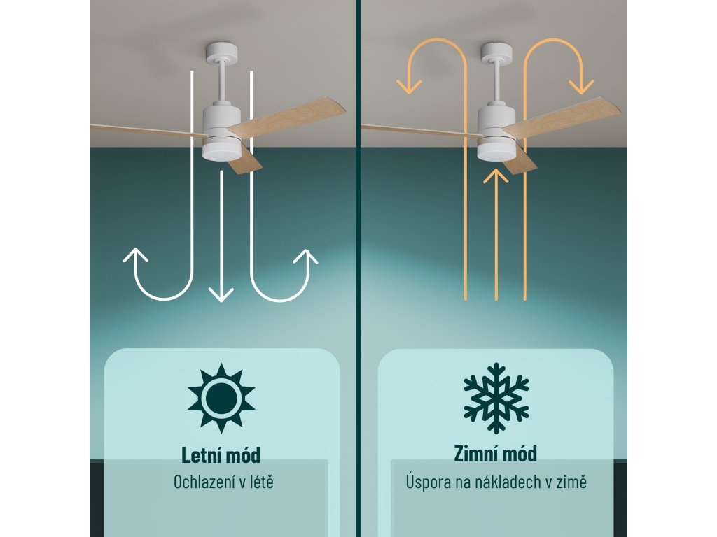 Jak to funguje? Ve vytápěné místnosti se tvoří teplotní vrstvy: chladnější vzduch se drží u podlahy, zatímco lehčí teplejší vzduch stoupá vzhůru a ohřívá především strop. Tam nám ale není moc platný. Teplo potřebujeme hlavně u podlahy. Tady přichází na řadu stropní ventilátor, který teplotní vrstvy rozruší jemným pohybem vzduchu a prohřeje místnost rovnoměrně.