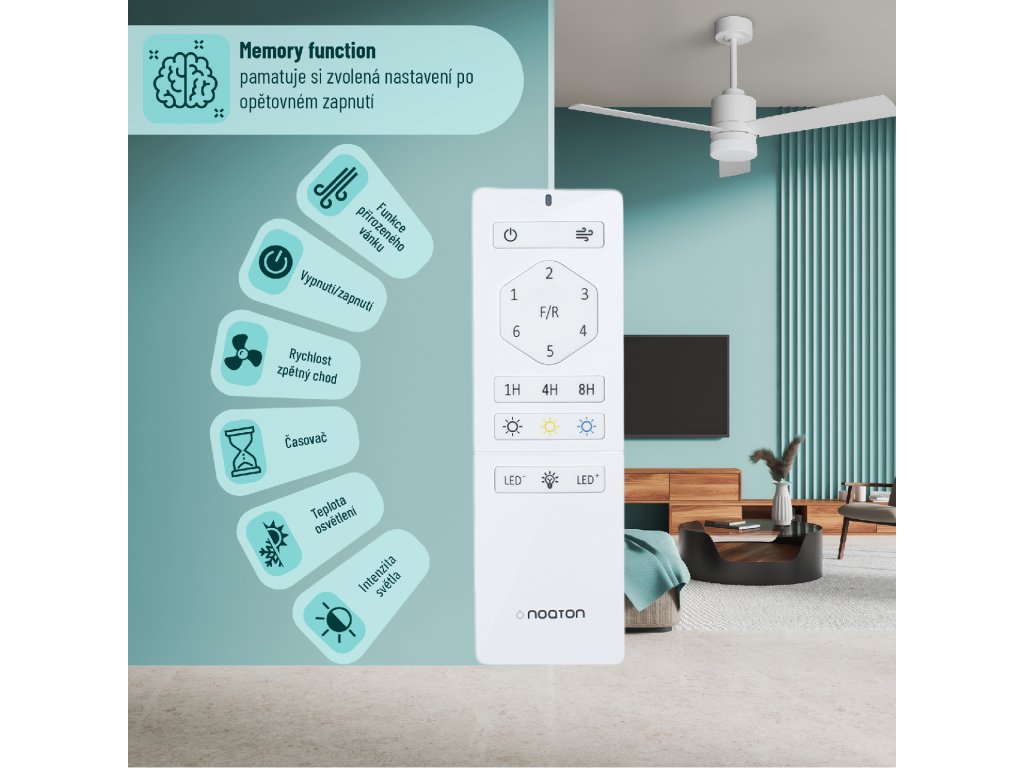 Třešničkou na dortu je dálkové ovládání v balení, umožňující nastavení těch nejmenších detailů, aniž byste museli opustit pohodlí svého gauče nebo postele. Jedním kliknutím můžete vybrat intenzitu světla, rychlost ventilátoru, odstín osvětlení nebo jednu z chytrých funkcí, kterou je ventilátor vybaven. Součástí je i držák na zeď, aby mělo ovládání u vás doma vždy své místo.