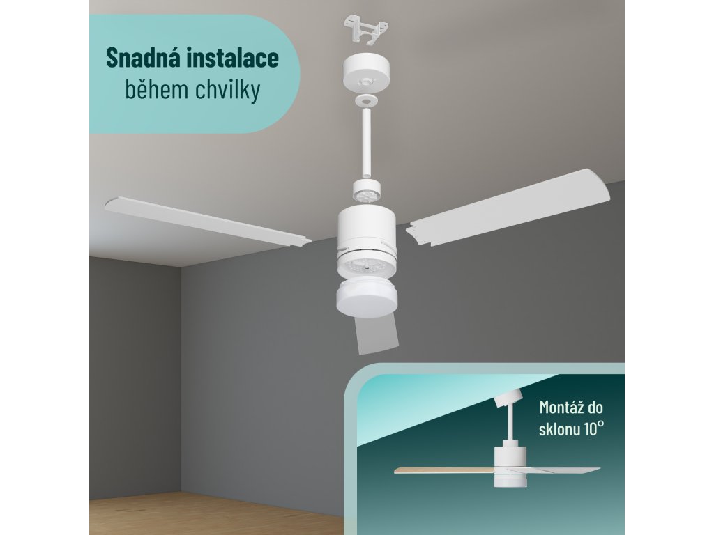 průměrem 132 cm a průtokem vzduchu až 196 m3/min se stropní ventilátor hodí do místností už od 10 m2 a díky jeho přizpůsobitelnosti nabízí možnost montáže na šikmý strop až do 10° sklonu. Také jistě oceníte nepostradatelnou funkci zpětného chodu, která v zimě ušetří vaše náklady za topení.