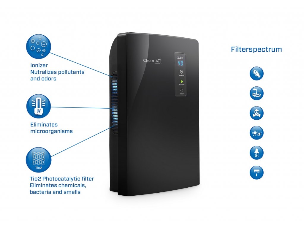 Ionizátory vzduchu generují záporné ionty (anionty), a tím je dosaženo hned několika efektů. Dýcháme vzduch mající efekt čerstvého vzduchu po bouřce. Civilizace produkuje mnoho kladných iontů (DVD, TV, auta atd.), jež mají škodlivý účinek na zdraví (bolest hlavy, únava, ospalost). Záporné ionty neutralizují ve vzduchu kladné ionty (kationty). Nabité částice shlukují na sebe i ty nejmenší částice prachu, a tyto shluky spadnou na horizontální plochu, kde se snadně odstraní hadrem nebo vysavačem. Nevýhodou ionizátorů je, že mohou produkovat ozon, který je ve větším množství škodlivý pro zdraví (obzvlášť pro astmatiky). Dle normy ČSN EN 60335-2-65 produkce ozonu nesmí překročit 0,05 ppm. Tuto normu musí splňovat jakákoliv čistička vzduchu s ionizátorem nebo samotný ionizátor na českém trhu. Čističky vzduchu s ionizátorem Clean Air Optima splňují normu 60335-2-65. Ionizátor nevyžaduje žádnou údržbu. Životnost ionizátoru není omezená.