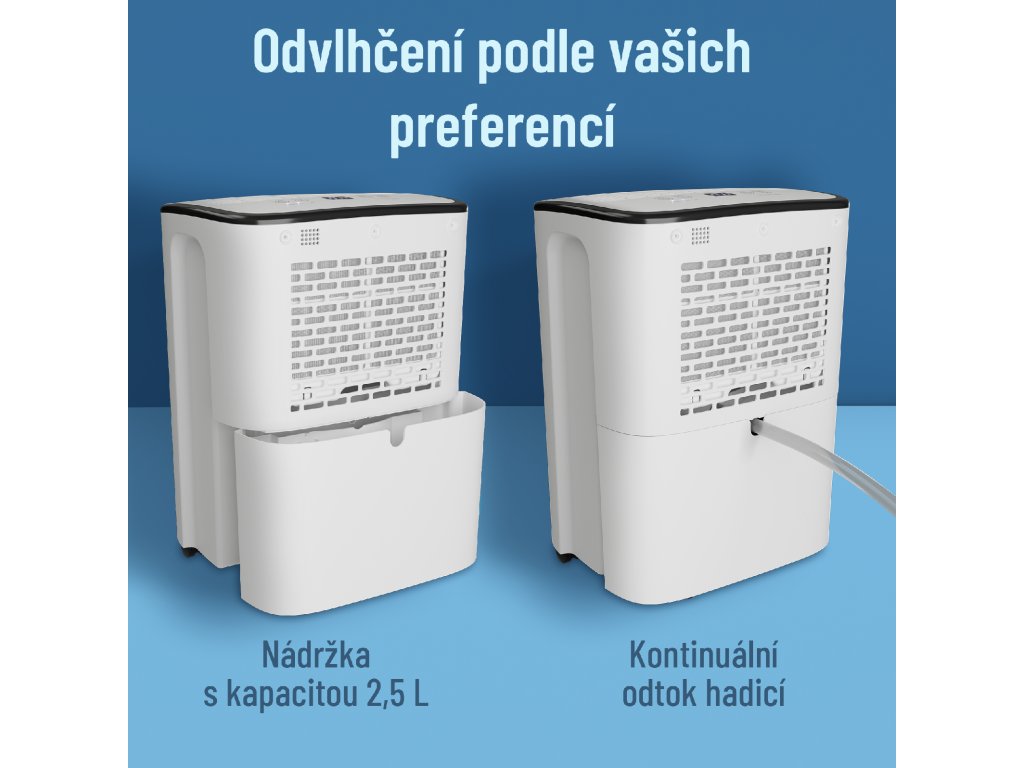 - Vysoušeč je vybaven vodní nádržkou o objemu 2,5 litrů. Pokud chcete odvlhčovat bez vaší přítomnosti, je možné pro odvod kondenzátu použít odtokovou hadici, která je součástí balení.