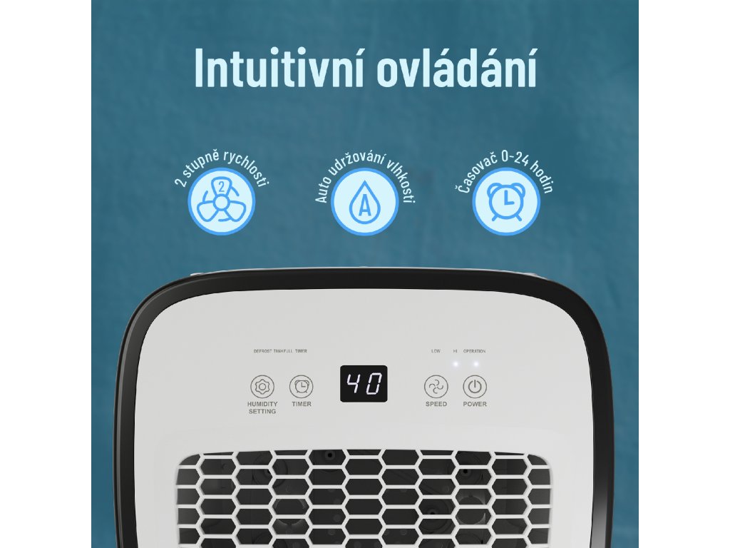 - Odvlhčovač bude fungovat po dobu, kterou nastavíte pomocí časovače (0-24h) a poté se zařízení automaticky vypne.