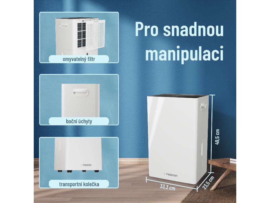 Kompaktní rozměry 330 x 495 x 235 mm a hmotnost 10,7 kg zajišťují pohodlnou manipulaci s přístrojem, zatímco boční úchyty a spodní kolečka usnadňují transport při převozu odvlhčovače, kterou tak hravě zvládne každý.