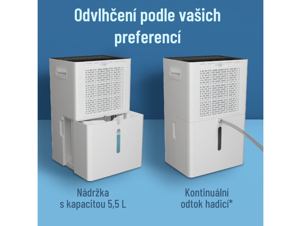 - Vysoušeč je vybaven vodní nádržkou o objemu 5,5 litrů. Pokud chcete odvlhčovat bez vaší přítomnosti, je možné pro odvod kondenzátu použít odtokovou hadici, která je součástí balení.