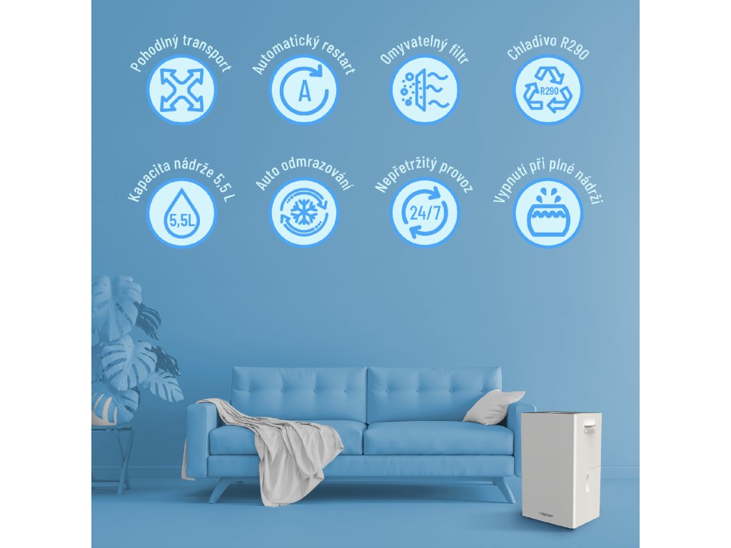 Tento odvlhčovač vzduchu je nejen účinným nástrojem proti nadměrné vlhkosti, ale také přináší mnoho dalších výhod – zabraňuje vzniku plísní, urychluje sušení prádla a omezuje nepříjemné pachy. Díky jeho schopnosti eliminovat nečistoty v ovzduší také napomáhá při dýchacích obtížích a vytváří zdravější a čistější prostředí ve vašem domově.