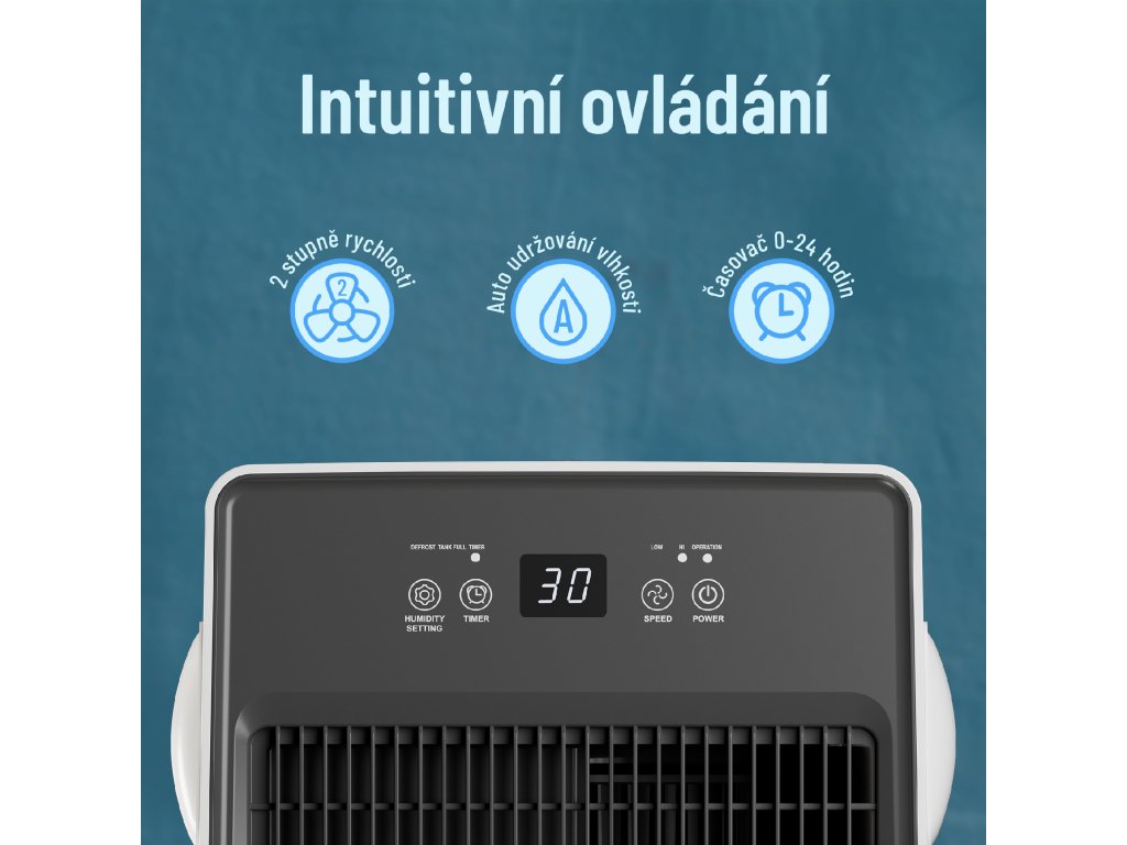 Odvlhčovač je vybaven funkcí automatického udržování vlhkosti v rozmezí 30-90%, které si můžete nastavit podle vlastních preferencí, zatímco aktuální vlhkost můžete zkontrolovat na přehledném dotykovém displeji.