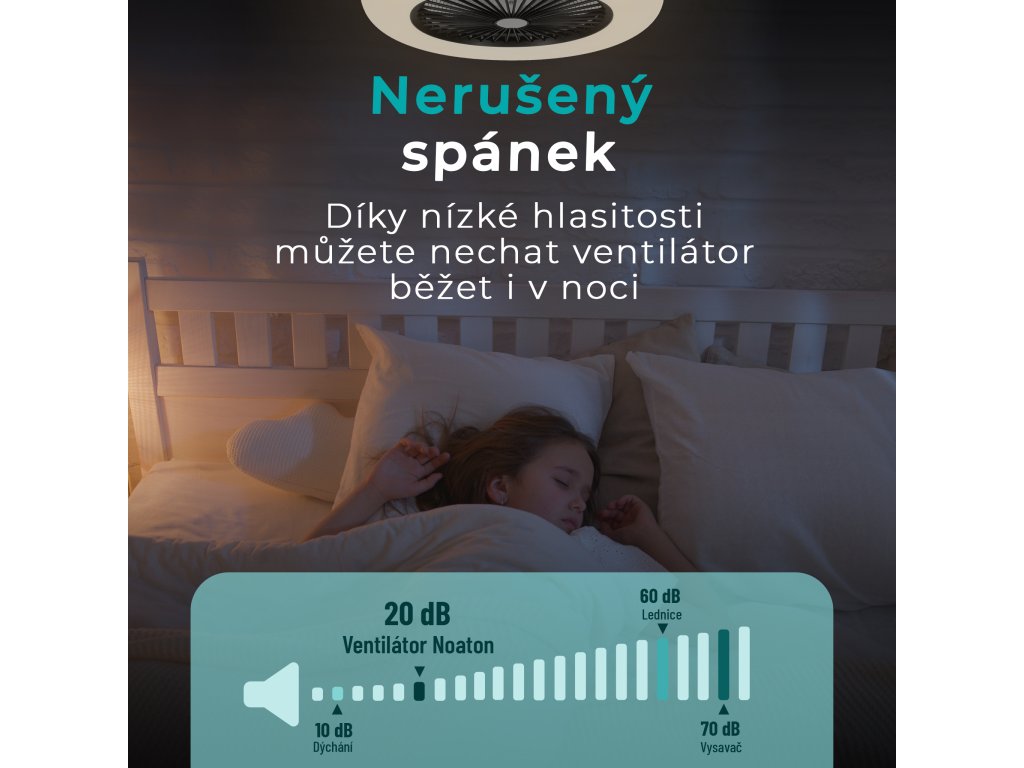 Ventilátor se světlem značky Noaton je praktický pomocník nejen v horkých letních dnech. Pyšní se 5 lopatkami (materiál ABS), které je možné pohánět hned ve 6 rychlostních stupních, regulovatelným světlem a funkcí časovače. To vše je v přístroji, který je nejen úsporný (maximální příkon motoru je 20 W), ale i lehký a tím pádem jej lze umístit téměř kamkoliv (dokonce i na zeď, tedy pod úhel 90°).