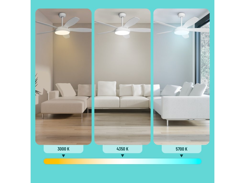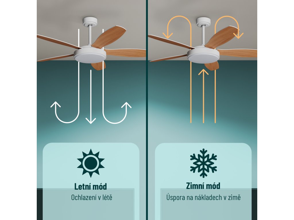 Tento stropní ventilátor s oboustrannými lopatkami (bílá/javor) disponuje integrovaným LED světlem. Nabízí nejen efektivní větrání, ale také osvětlení místnosti. S průměrem 132 cm a pěti lopatkami má tento ventilátor vzduchový průtok v rozmezí 99 až 198 m3/min, což zajišťuje dostatečný proud vzduchu v místnosti. LED modul má maximální výkon 24 W a může být přizpůsoben s teplotou světla v rozmezí 3000 až 5700 K.