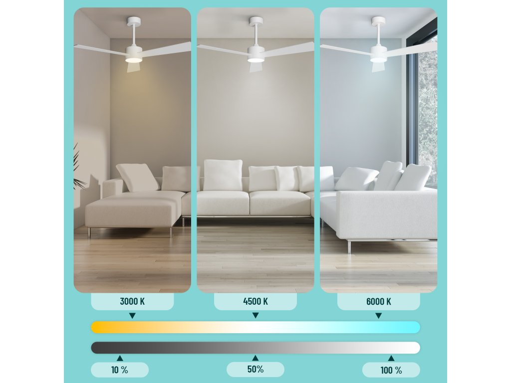 Ať už je vaše světelná preference jakákoliv, stropní ventilátor Lepus se vám jistě trefí do vkusu. Potřebujete se soustředit během studia nebo práce? Zkuste nastavit studený odstín LED osvětlení (6000 K) a vaše produktivita vystoupá k výšinám. Plánujete večer s přáteli nebo rodinné posezení? Teplý odstín (3000 K) vám vytvoří komfortní prostředí pro uvolněnou konverzaci. Jestliže hledáte kompromis mezi těmito odstíny, můžete se vydat zlatou střední cestou a nastavit přirozené denní světlo (4500 K).