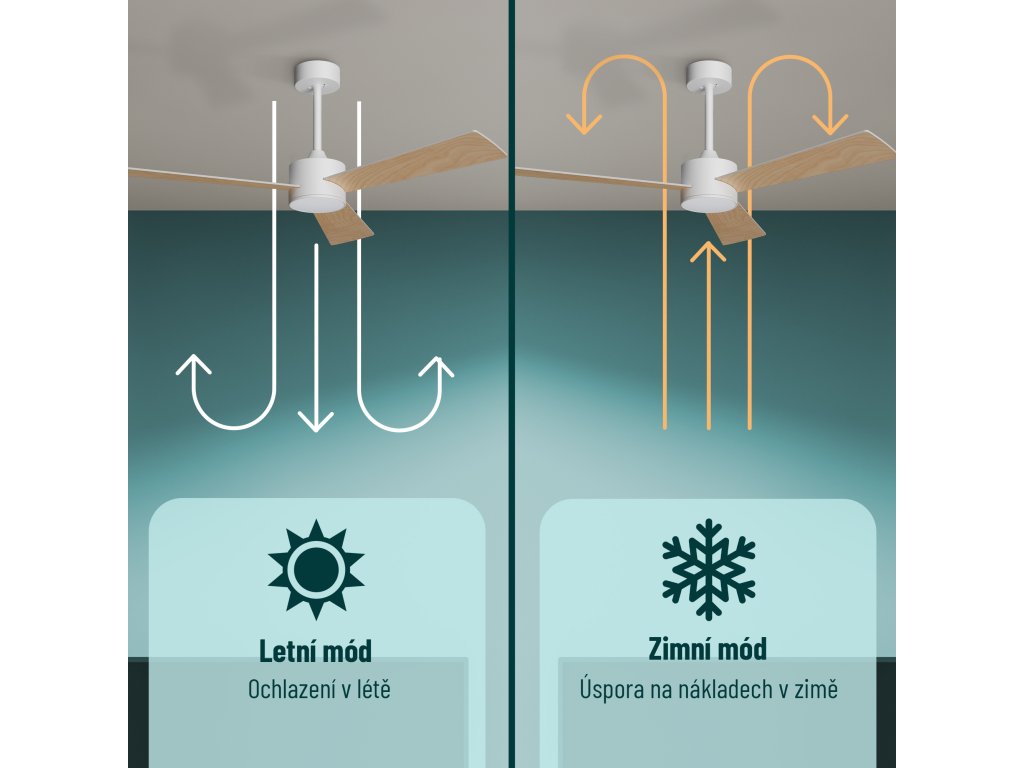 Jak to funguje? Ve vytápěné místnosti se tvoří teplotní vrstvy: chladnější vzduch se drží u podlahy, zatímco lehčí teplejší vzduch stoupá vzhůru a ohřívá především strop. Tam nám ale není moc platný. Teplo potřebujeme hlavně u podlahy. Tady přichází na řadu stropní ventilátor, který teplotní vrstvy rozruší jemným pohybem vzduchu a prohřeje místnost rovnoměrně.