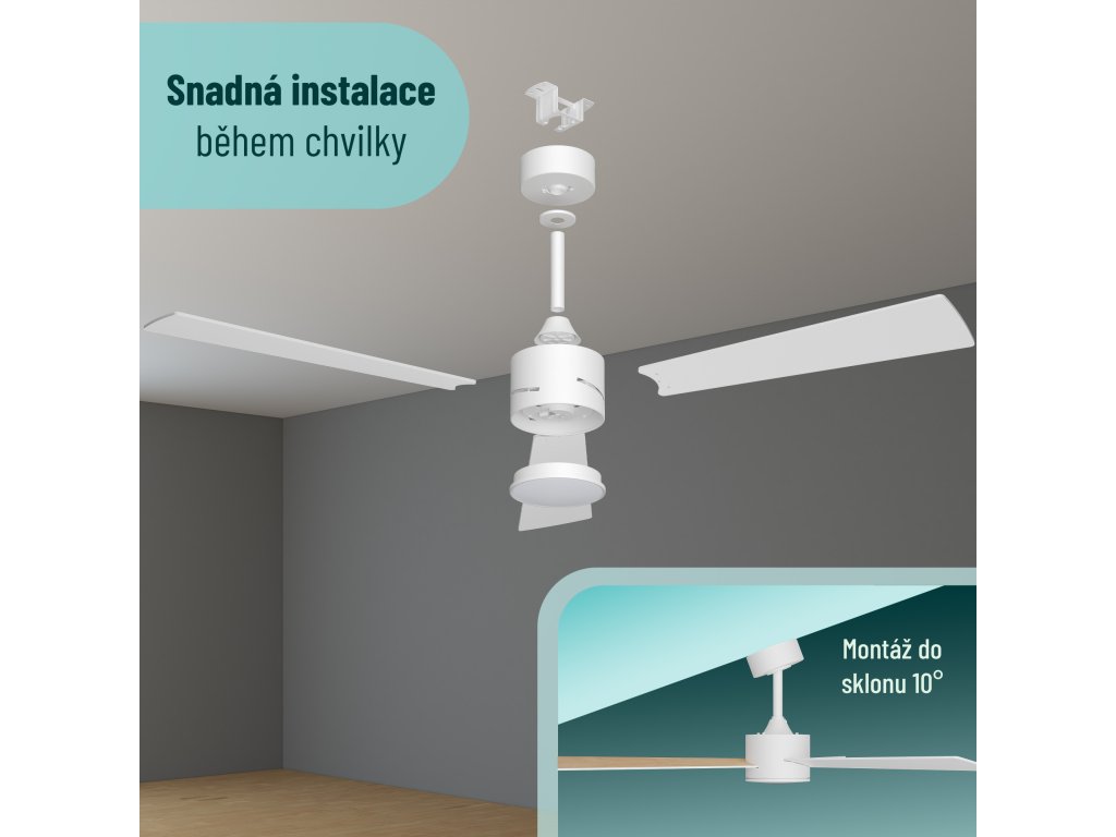 S průměrem 132 cm a průtokem vzduchu až 196 m3/min se stropní ventilátor hodí do místností už od 10 m2 a díky jeho přizpůsobitelnosti nabízí možnost montáže na šikmý strop až do 10° sklonu. Také jistě oceníte nepostradatelnou funkci zpětného chodu, která v zimě ušetří vaše náklady za topení.