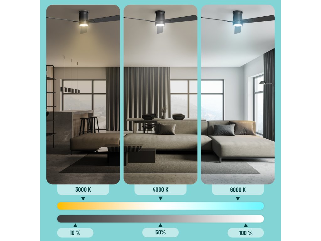 Ať už je vaše světelná preference jakákoliv, stropní ventilátor Rhea se vám jistě trefí do vkusu. Potřebujete se soustředit během studia nebo práce? Zkuste nastavit studený odstín LED osvětlení (6000 K) a vaše produktivita vystoupá k výšinám. Plánujete večer s přáteli nebo rodinné posezení? Teplý odstín (3000 K) vám vytvoří komfortní prostředí pro uvolněnou konverzaci. Jestliže hledáte kompromis mezi těmito odstíny, můžete se vydat zlatou střední cestou a nastavit přirozené denní světlo (4000 K).