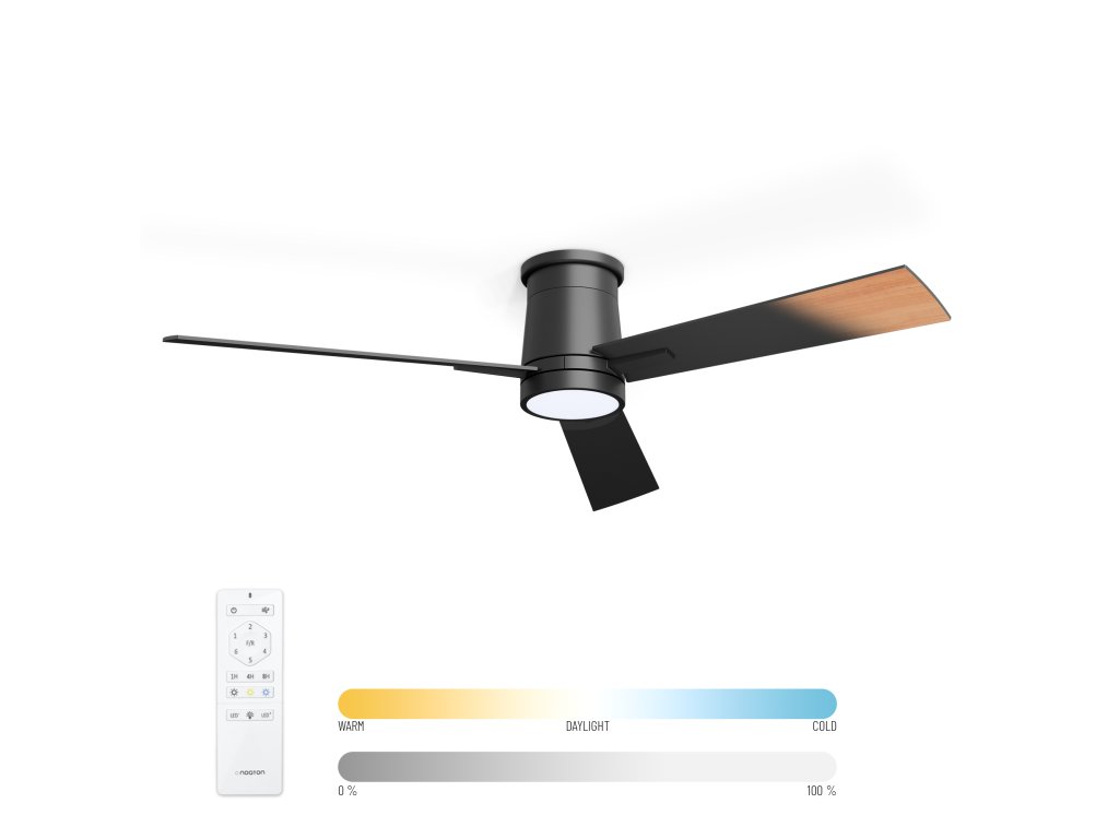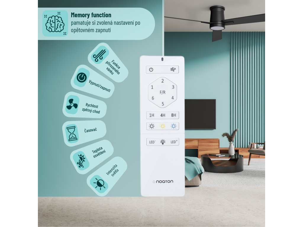 Třešničkou na dortu je dálkové ovládání v balení, umožňující nastavení těch nejmenších detailů, aniž byste museli opustit pohodlí svého gauče nebo postele. Jedním kliknutím můžete vybrat intenzitu světla, rychlost ventilátoru, odstín osvětlení nebo jednu z chytrých funkcí, kterou je ventilátor vybaven. Součástí je i držák na zeď, aby mělo ovládání u vás doma vždy své místo.
