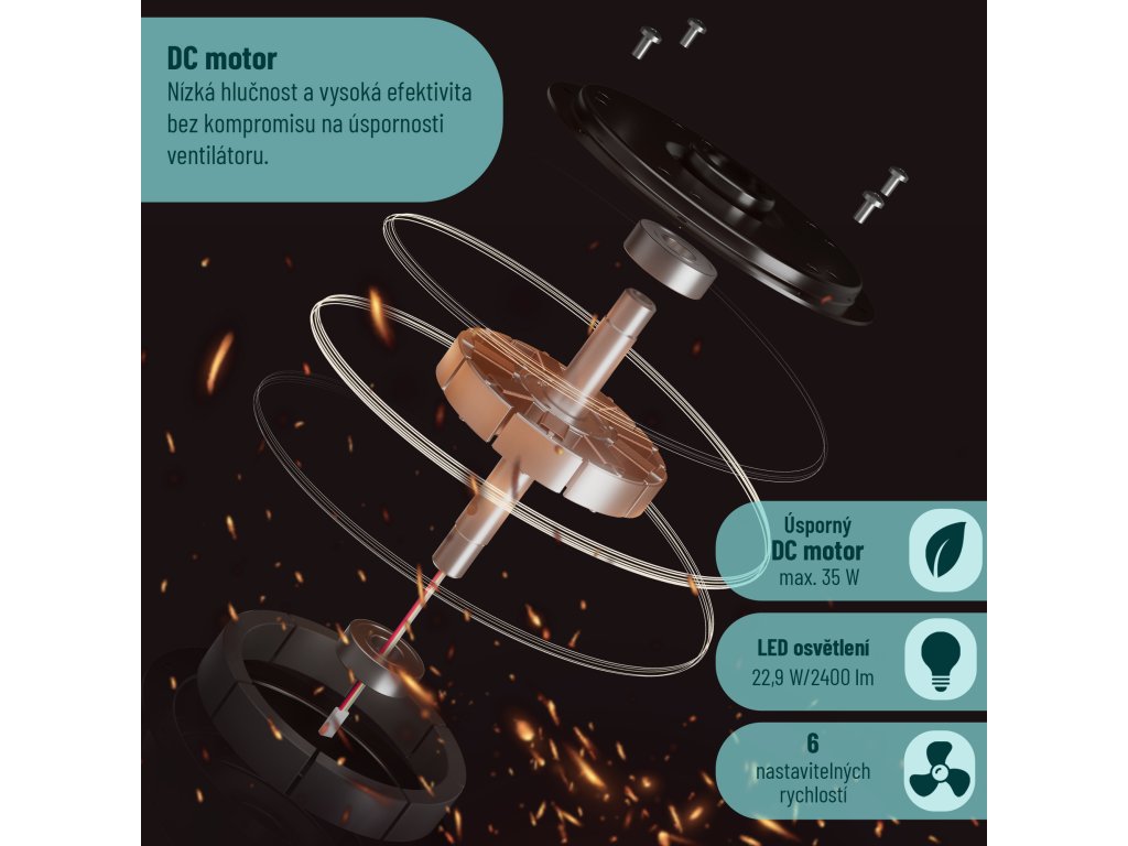 Tento stropní větrák jsme vybavili DC motorem s maximálním výkonem 35 W. Oproti klasickým AC motorům využívá elektronickou komutaci, a díky tomu spotřebovává až 50 % méně energie, čímž šetří nejen vaši peněženku ale i planetu.