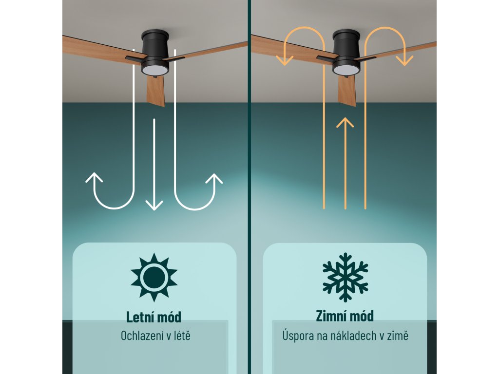 V zimě by se stropní ventilátory měly točit pomalu po směru hodinových ručiček. Tím dochází k nasávání studeného vzduchu zespodu a současně je stoupající teplý vzduch vytlačován podél stěn k zemi. Pozvolná cirkulace promíchává vrstvy vzduchu a vyrovnává teplotu v celé místnosti, ale bez průvanu. Takže nastavte topení místo 24 °C třeba na 18 °C a ušetřete až 20 % nákladů na topení.