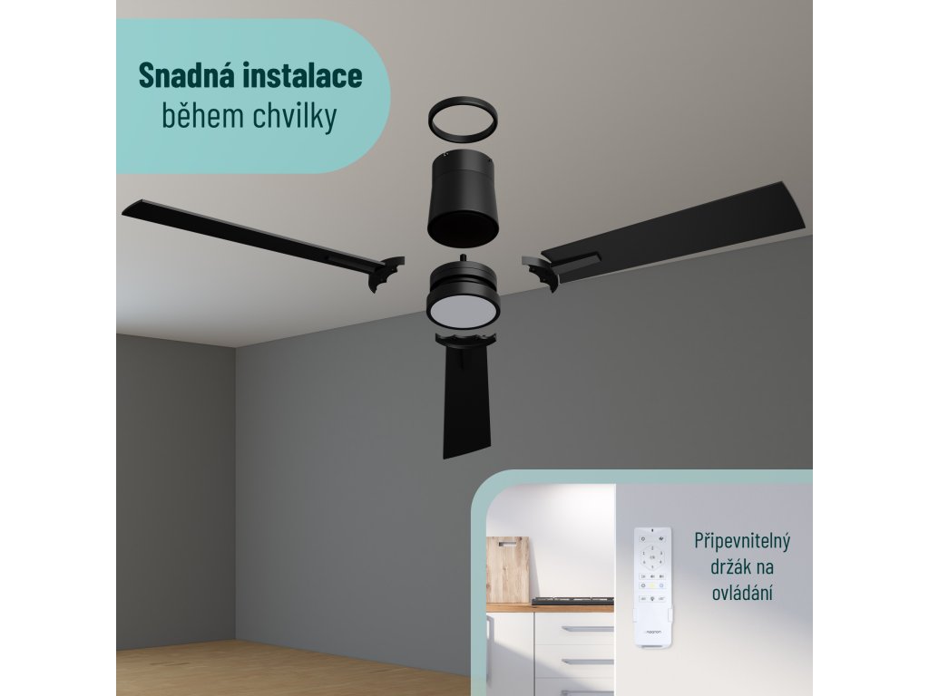 Třešničkou na dortu je dálkové ovládání v balení, umožňující nastavení těch nejmenších detailů, aniž byste museli opustit pohodlí svého gauče nebo postele. Jedním kliknutím můžete vybrat intenzitu světla, rychlost ventilátoru, odstín osvětlení nebo jednu z chytrých funkcí, kterou je ventilátor vybaven. Součástí je i držák na zeď, aby mělo ovládání u vás doma vždy své místo.