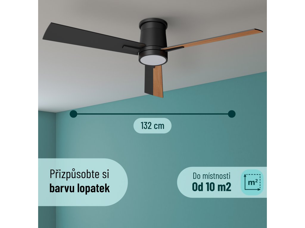 Tento stropní větrák jsme vybavili DC motorem s maximálním výkonem 35 W. Oproti klasickým AC motorům využívá elektronickou komutaci, a díky tomu spotřebovává až 50 % méně energie, čímž šetří nejen vaši peněženku ale i planetu.