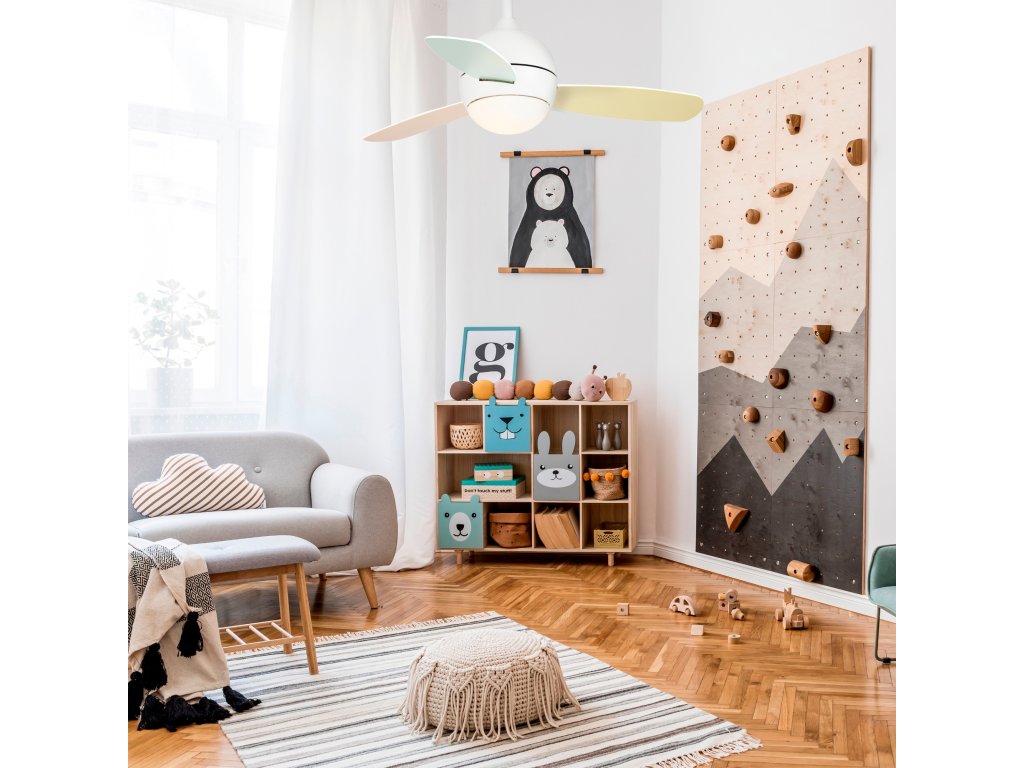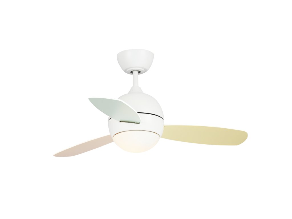 Stropní ventilátor Sulion 075836 Kuma s oboustrannými lopatkami v barvách bílá a různobarevná. Lopatky se dají otočit kteroukoli stranou dolů a lze tak vytvořit 2 barevné kombinace. Těleso je z kovu a má bílou barvu. Osvětlení zajišťuje světelný zdroj E27 o síle 40W (není v balení). Je vhodný pro místnosti o velikosti do 14 m2. Reverzní lopatky umožňují oteplování místnosti v zimě - zimní (zpětný) chod stropního ventilátoru tlačí teplý vzduch od stropu dolů. Ventilátor je možné namontovat s tyčí a také na lehce šikmý strop.