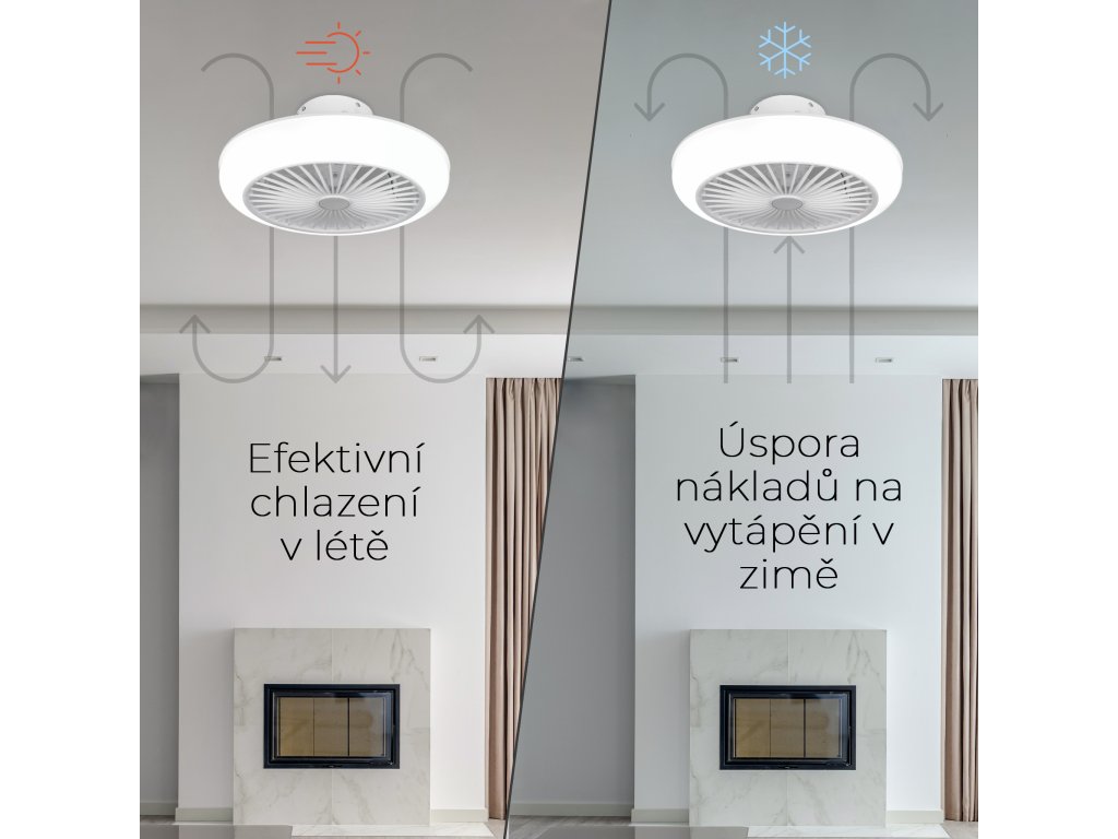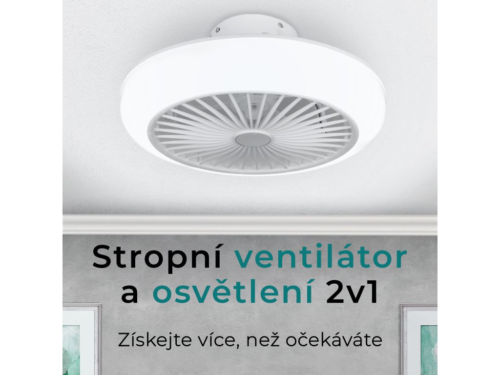 Vestavěný ventilátor s 5 lopatkami z odolného ABS materiálu nabízí 6 úrovní výkonu a tichý provoz. Díky nízké hmotnosti a úspornému chodu (maximální příkon motoru je 20W) je možné tento lustr s ventilátorem instalovat i na stěnu pod úhlem 90°. Samotné lopatky jsou navíc chráněny robustním tělem svítidla a zamezují tak případné riziko poranění.