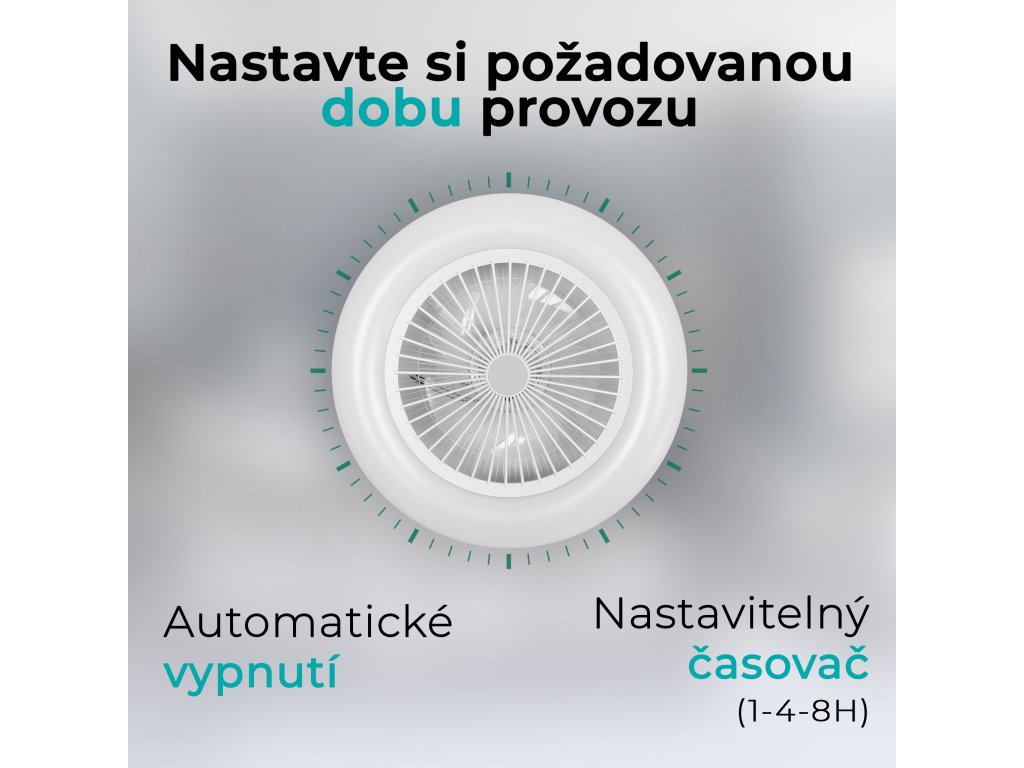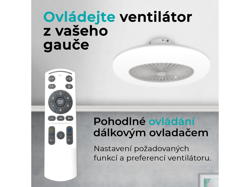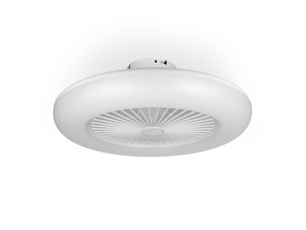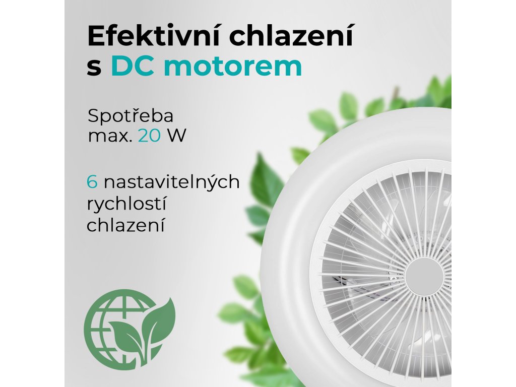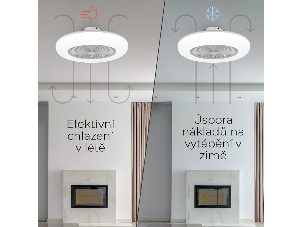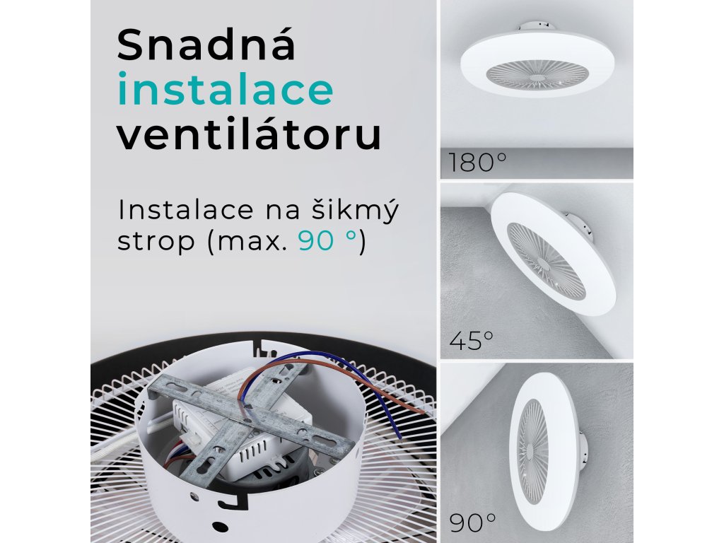 Vestavěný ventilátor s 5 lopatkami z odolného ABS materiálu nabízí 6 úrovní výkonu a tichý provoz. Díky nízké hmotnosti a úspornému chodu (maximální příkon motoru je 20W) je možné tento lustr s ventilátorem instalovat i na stěnu pod úhlem 90°. Samotné lopatky jsou navíc chráněny robustním tělem svítidla a zamezují tak případné riziko poranění.