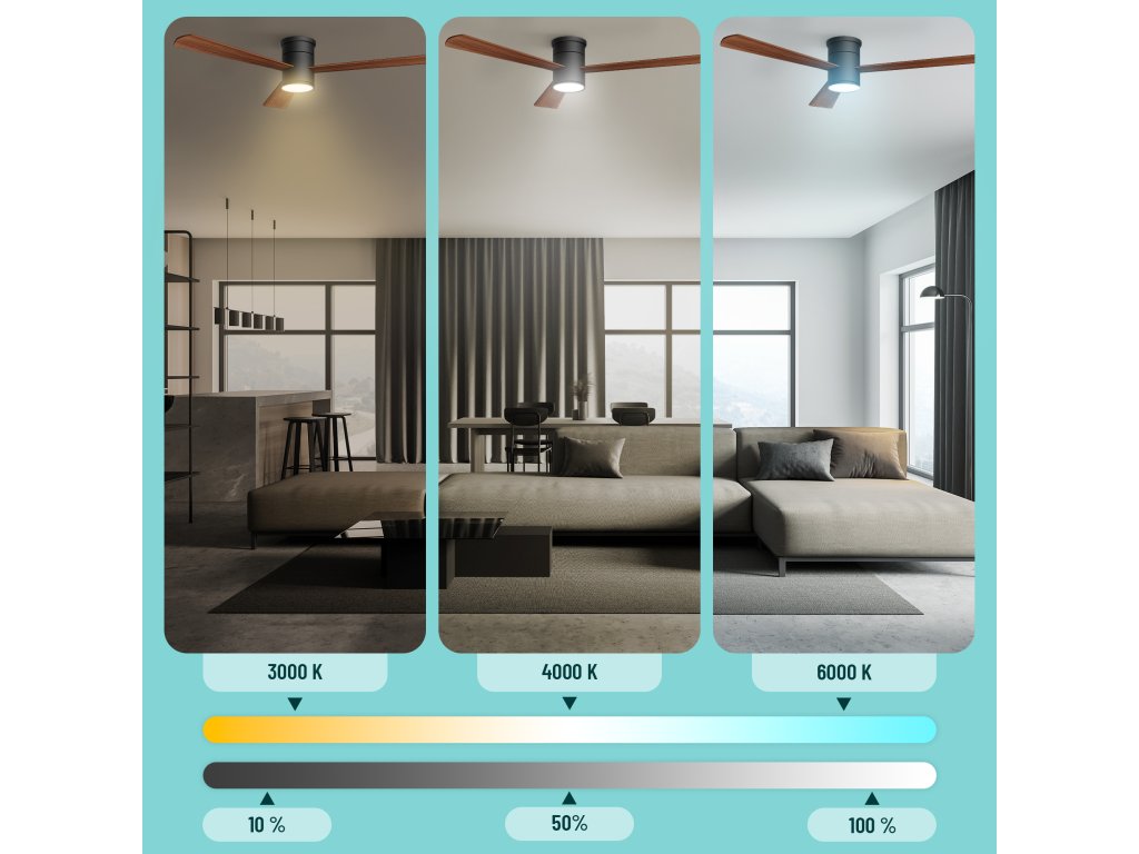 legantní stropní světlo Noaton Zoya BDL kombinuje LED osvětlení s praktickým ventilátorem. Největší předností tohoto zařízení je plně regulovatelné LED osvětlení, které si můžete přizpůsobit přesně podle svých potřeb. Pomocí dálkového ovládání snadno nastavíte nejen intenzitu světla, ale také jeho barevnou teplotu – od studené bílé pro aktivní denní režim až po teplé tóny vhodné k večernímu odpočinku. Nechybí ani praktická funkce stmívání, která umožní vytvořit příjemnou atmosféru v každé situaci.