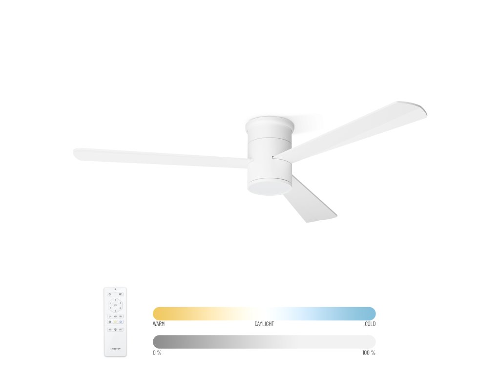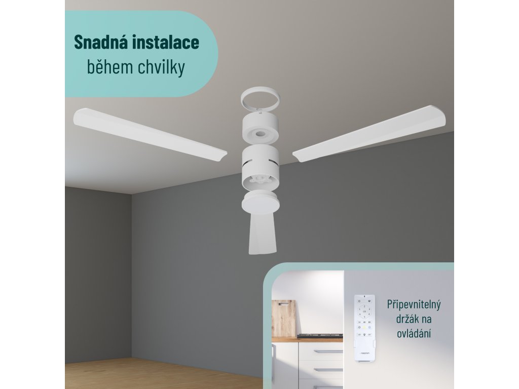 Třešničkou na dortu je dálkové ovládání v balení, umožňující nastavení těch nejmenších detailů, aniž byste museli opustit pohodlí svého gauče nebo postele. Jedním kliknutím můžete vybrat intenzitu světla, rychlost ventilátoru, odstín osvětlení nebo jednu z chytrých funkcí, kterou je přístroj vybaven. Součástí je i držák na zeď, aby mělo ovládání u vás doma vždy své místo.